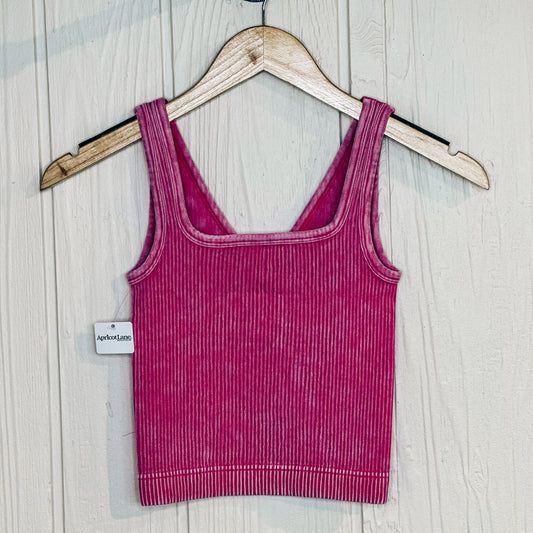2 Way Neckline Washed Ribbed Cropped Tank Top - Hot Pink