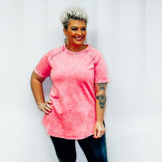 French Terry Acid Wash Short Cuff Sleeve Pullover - Viva Magenta