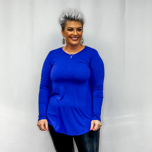 Long Sleeve Round Neck Round hem Top - Bright Blue